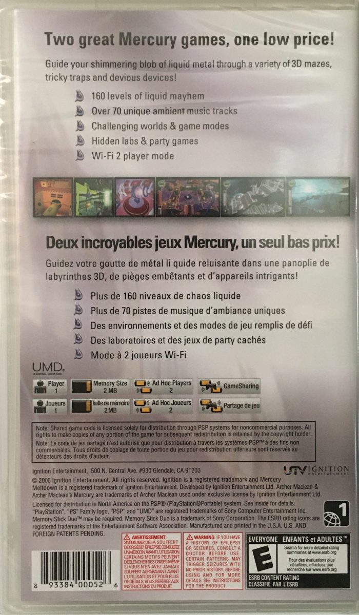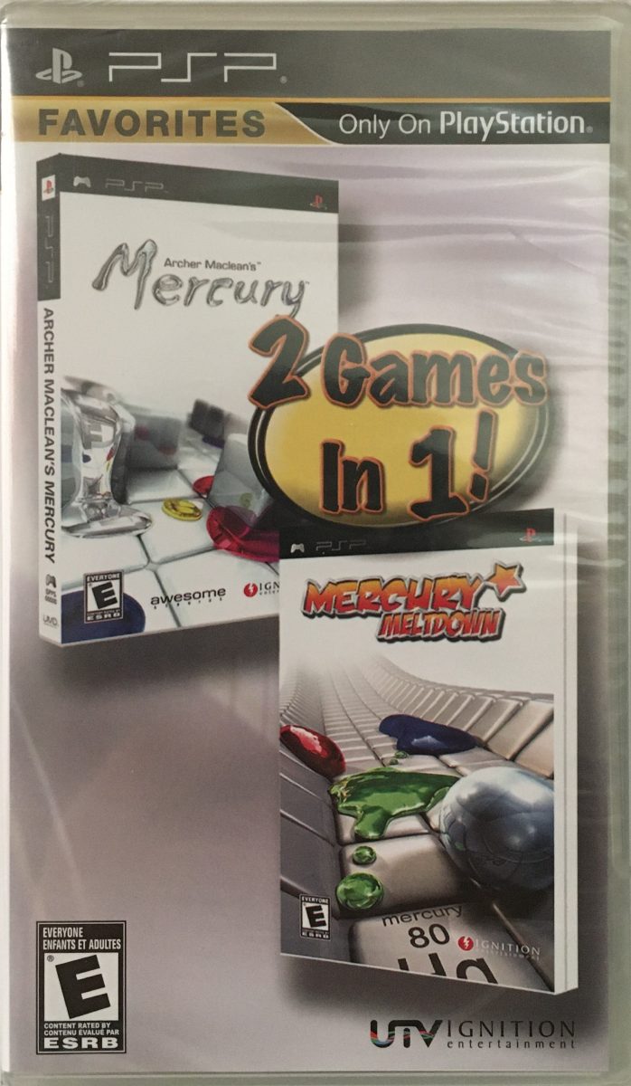 2 Games in 1! Archer Maclean’s Mercury and Mercury Meltdown PSP is a puzzle-platform compilation where players control a small, liquid metal blob called Mercury, guiding it through increasingly complex mazes and hazards using tilt-based or analog controls. Archer Maclean’s Mercury features over 100 levels focused on timing, precision, and problem-solving with obstacles like spikes, moving platforms, and crushers. Mercury Meltdown PSP builds on the original with more intricate puzzles, new mechanics such as splitting and merging Mercury, dynamic level designs, and additional time-trial and score-based challenges. Together, the two games provide a full, engaging tilt-and-roll puzzle experience with colorful graphics and addictive gameplay.