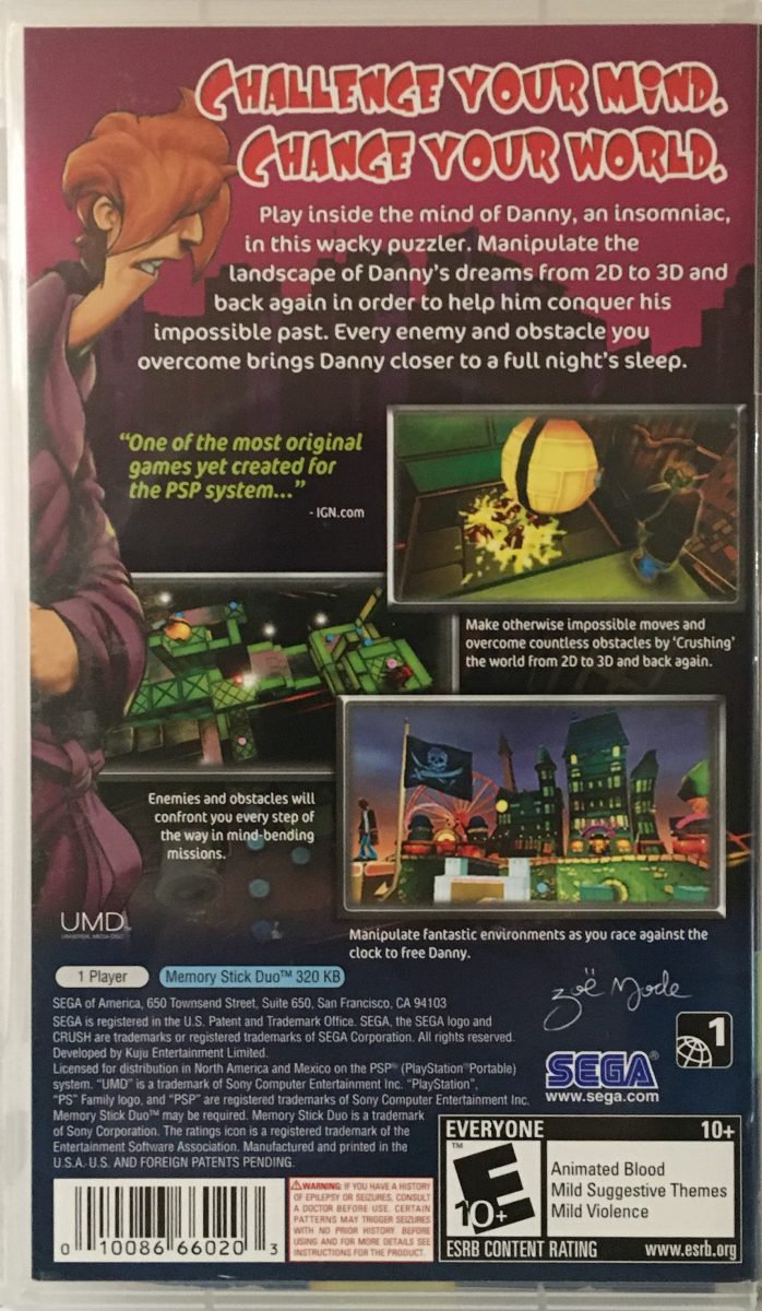 Crush for the PSP is a puzzle-platformer where you play as Danny, a young man trapped in vivid, surreal dreams. The core mechanic of the game is the ability to “crush” the 3D world into a 2D plane, allowing you to manipulate walls, floors, and obstacles to create new paths and solve intricate puzzles. Players must combine clever spatial reasoning with precise timing to navigate over 50 levels filled with hazards, enemies, and mind-bending challenges. The game’s dreamlike environments reflect Danny’s subconscious, offering a unique mix of platforming and puzzle-solving that was praised for its originality and inventive gameplay.
