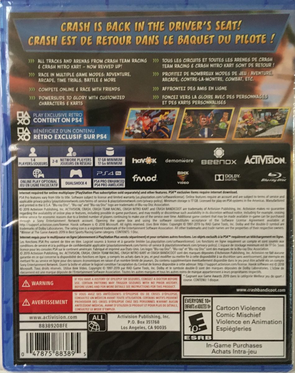 Crash Team Racing: Nitro-Fueled for PS4 is a full remaster of the classic kart racer, bringing back the original CTR experience with modern graphics, smoother controls, and tons of new content. Race as Crash and a wide roster of characters across colorful tracks, using power-ups, boosts, and tight drifting to outpace your rivals. The game includes all original modes plus online multiplayer, customization options, and bonus tracks from later Crash racing titles, making it a fast, chaotic, and fun kart-racing adventure for all ages.