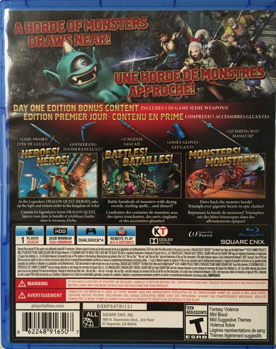 Dragon Quest Heroes: Day One Edition (PS4) is an action-packed hack-and-slash adventure that brings the classic Dragon Quest world to life in a fast-paced new way. Players team up with iconic heroes, battle hordes of monsters in massive real-time fights, and use powerful abilities to protect the kingdom of Arba. The Day One Edition adds exclusive bonus weapons, giving you a stronger start as you take on towering bosses and an epic story filled with charm, humor, and classic Dragon Quest style.