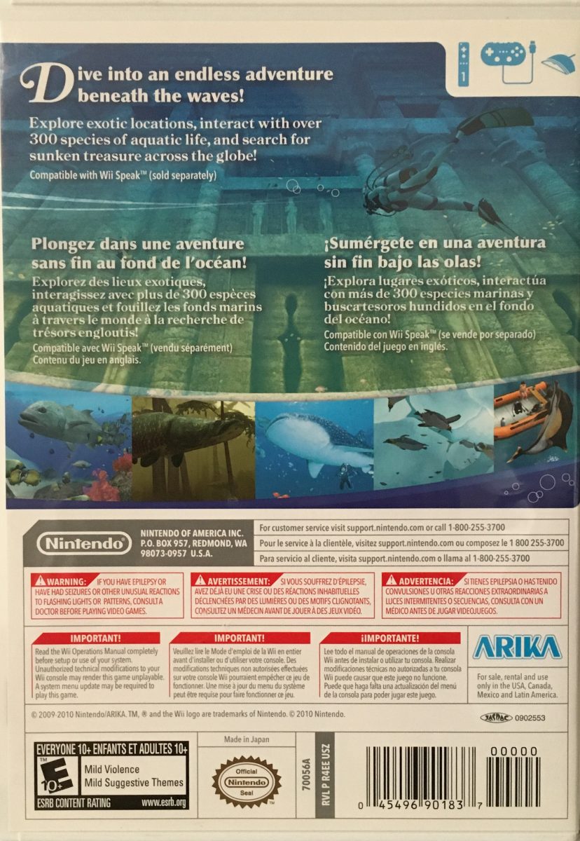 Dive into the beautiful and fascinating undersea world of Endless Ocean: Blue World! Travel across the globe–dive in exotic locations, enjoy interacting with over 350 different species of marine life, and explore sunken ruins for clues as you unravel the mysteries of an ancient underwater civilization and search for its legendary hidden treasure. Dive the World! Explore the unique and breathtaking underwater environments and marine life of multiple exciting dive spots around the world. From dolphins, sharks, and whales in the South Pacific, to piranhas and electric eels in a tributary of the Amazon River, there’s never a dull moment exploring the endless blue world beneath the waves. Escape into Blue! Witness the majesty of the sea up close and personal from the comfort of your living room. Relax and explore the ocean at your leisure while you discover exotic underwater species, interact with them to learn fun and interesting facts, and take stunning photographs of anything and everything that catches your eye. Explore shipwrecks and ancient ruins while you search for sunken treasure and adventure through the main story, or even expand and cultivate your own private coral reef! Share the Seas!