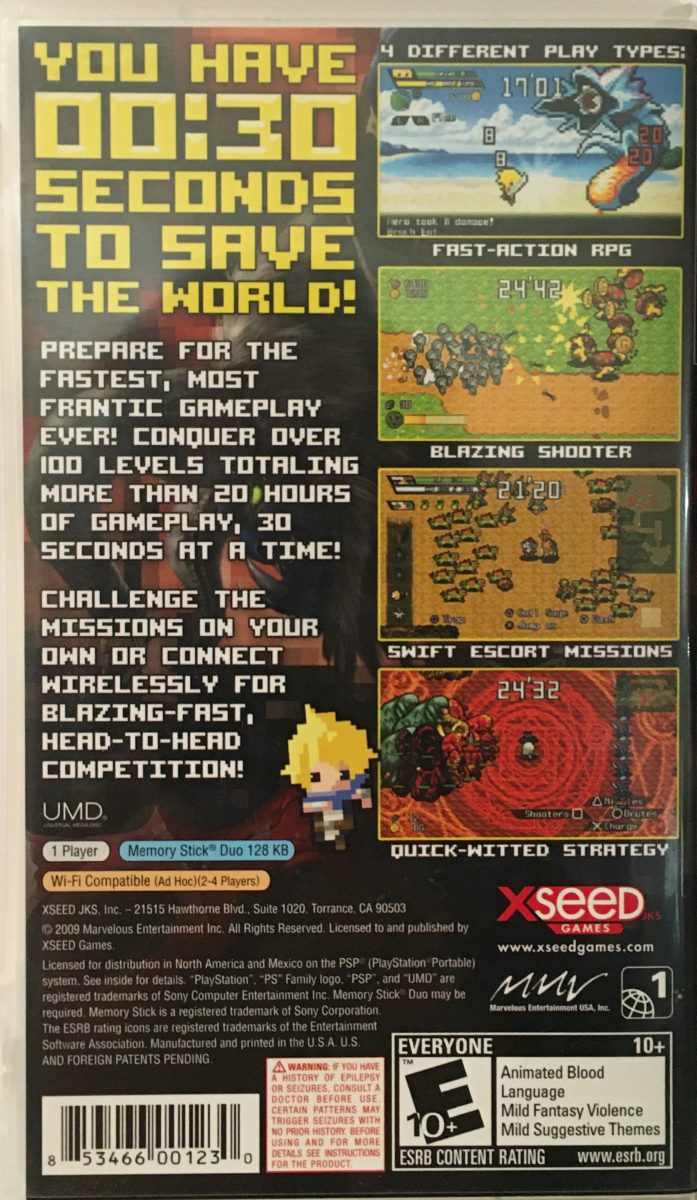 Half-Minute Hero is a hybrid real-time strategy action role-playing shoot ’em up video game developed by Opus.  It was initially released as a PlayStation Portable exclusive in Japan on May 28, 2009, later in North America on October 13, and in Europe on February 19, 2010. It was re-released on the Xbox Live Arcade on June 29, 2011 under the title Half-Minute Hero: Super Mega Neo Climax, and on Microsoft Windows‘ Steam on September 27, 2012 under the title Half-Minute Hero: Super Mega Neo Climax Ultimate Boy.