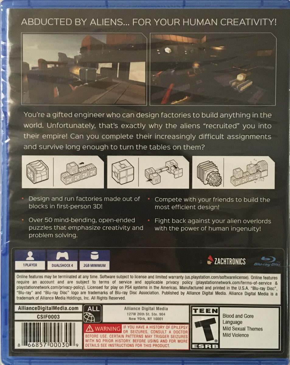 Infinifactory on PS4 is a first-person 3D puzzle game where you design and build complex production lines to solve manufacturing challenges for an alien overlord. Using conveyor belts, machines, and creative engineering, you assemble increasingly intricate structures in open, sandbox-style environments. It blends logic, automation, and hands-on construction, offering deep problem-solving and endless opportunities for inventive solutions.