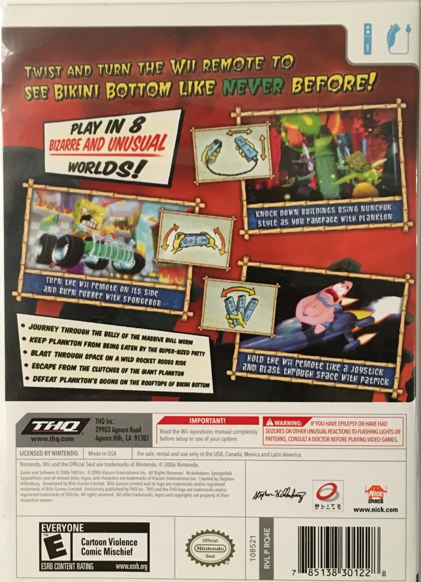 The game is divided into different stages, each offering a mix of platforming, combat, and puzzle-solving. Players can use the Wii remote and nunchuk to interact with the environment, perform attacks, and navigate through the whimsical levels. The humor and charm of the SpongeBob series are prominent throughout, with familiar characters like Patrick, Squidward, and Mr. Krabs making appearances.