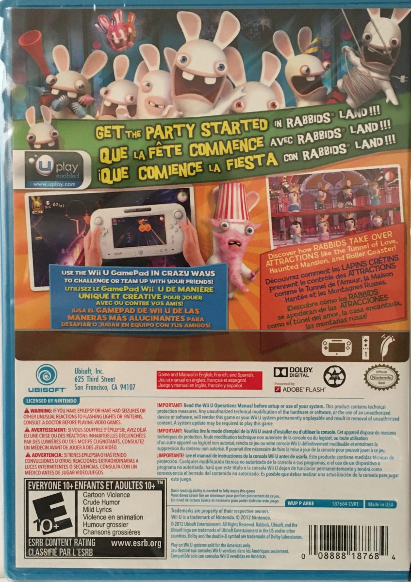 Rabbids Land Wii U is a party video game developed and published by Ubisoft for the Nintendo Wii U. The game follows the chaotic Rabbids as they take over a theme park, where players move across a board-game-style map and compete in a variety of minigames. Using the Wii U GamePad and Wii Remote, players roll dice, trigger events, and engage in short challenges that mix luck and simple motion-based gameplay. The game focuses on local multiplayer fun, combining unpredictable events, humorous animations, and competitive party gameplay designed for casual play with friends and family.