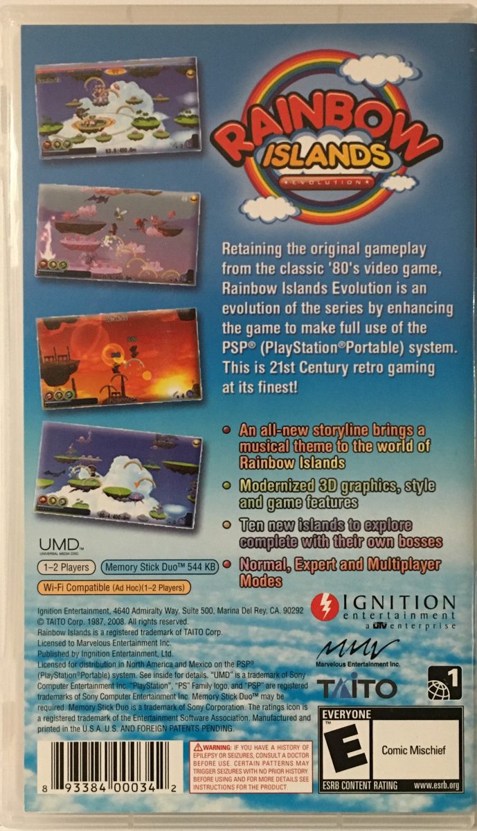Rainbow Islands: Evolution for the PSP is a 2007 3D action-platformer that reimagines the classic arcade game Rainbow Islands. Players control Bub and Bob, who must save the Rainbow Islands from an evil recording company polluting the environment with disruptive music. Using a magical hurdy-gurdy, they create rainbows that serve as both weapons to defeat enemies and platforms to climb each level. The game features vertical progression across multiple layers of platforms, blending traditional platforming with new 3D mechanics, and offers single-player and multiplayer modes, keeping the charm of the original while expanding its gameplay for modern audiences.
