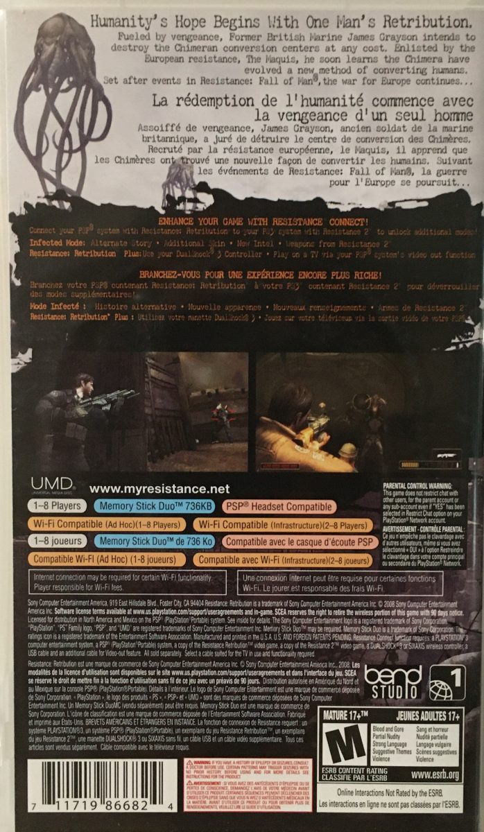 Resistance: Retribution is a third-person shooter video game developed by Bend Studio for PlayStation Portable. It was announced on July 15, 2008, at Sony’s E3 press conference and released on March 17, 2009, in North America, March 20, 2009, in Europe and March 26, 2009, in Australia. Bend Studio said in an interview with GameSpot that they worked with Insomniac Games in the initial process of the game design. It is set between Resistance: Fall of Man and Resistance 2. Sony has discontinued online support for the game.