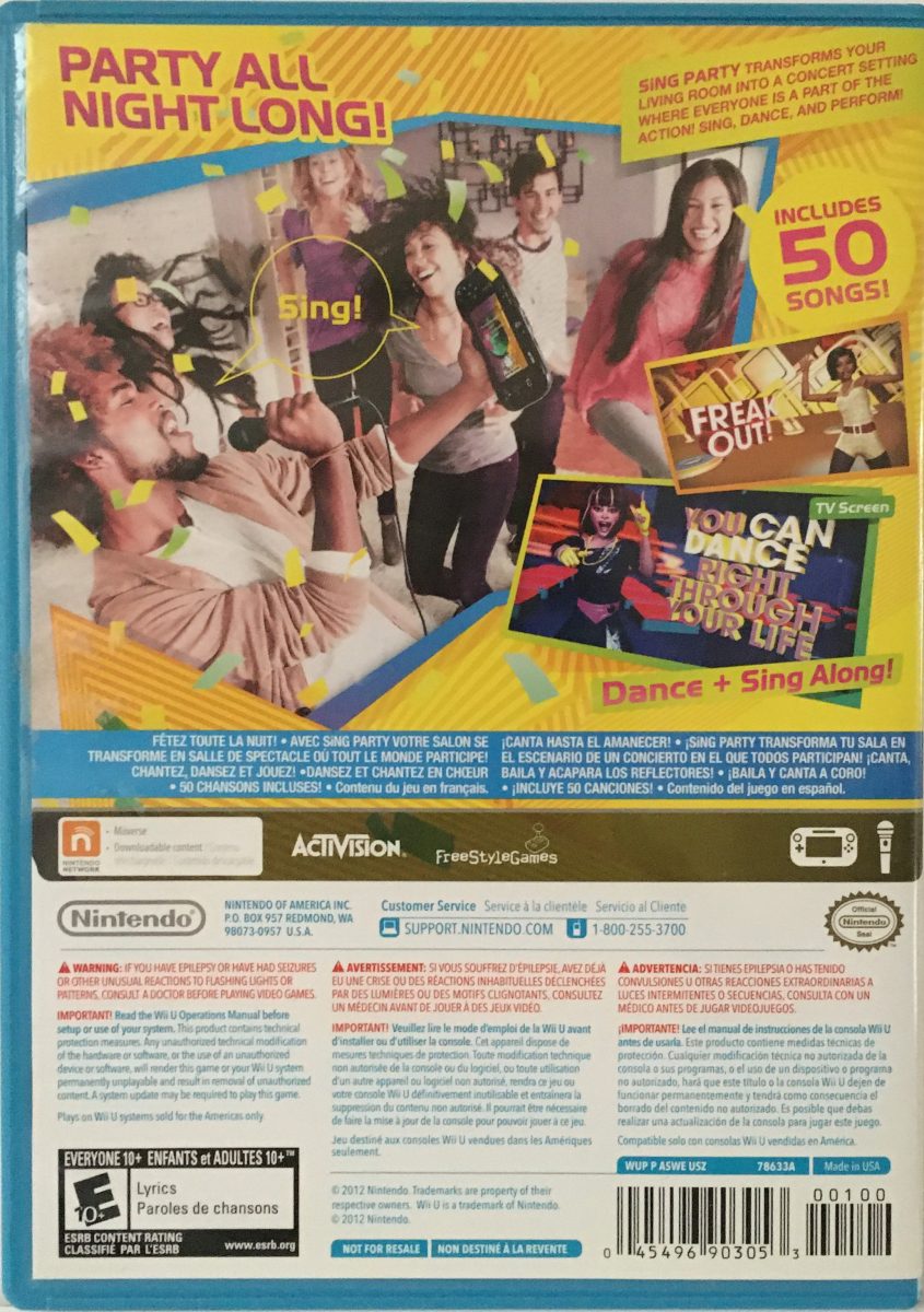 Sing Party Wii U is a karaoke-style party game developed by FreeStyleGames and published by Nintendo for the Nintendo Wii U that lets players sing along to popular songs using the Wii U GamePad as a personal lyrics screen while others watch on the TV, offering solo and multiplayer modes with party challenges, scoring based on pitch and timing, and a lively social experience designed for groups and casual fun.