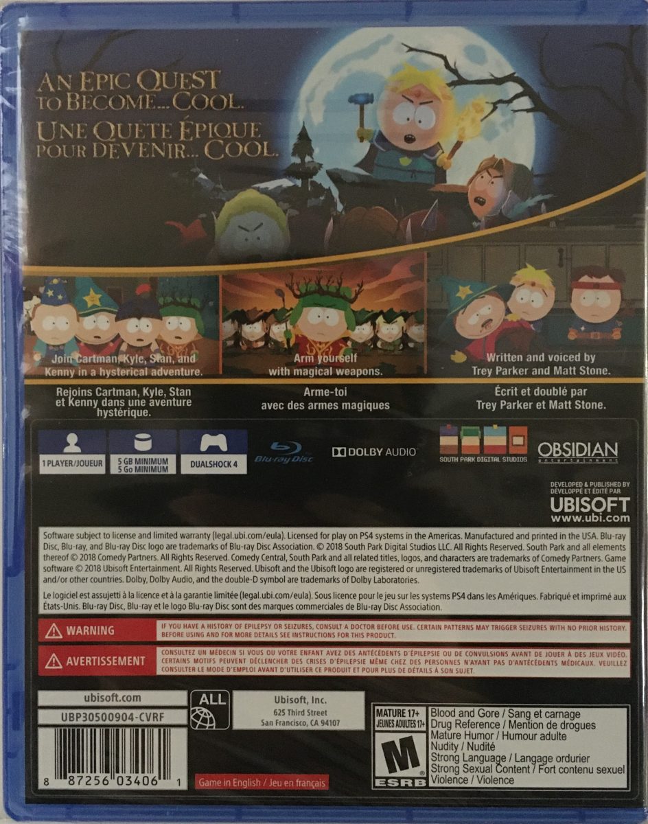 South Park – The Stick of Truth PS4 is a comedic role‑playing adventure that drops you into the animated world of South Park as “The New Kid,” where you join Stan, Kyle, Cartman, and Kenny in a wild, fantasy‑themed quest to retrieve the legendary Stick of Truth. Packed with the series’ trademark crude humor and outrageous scenarios, the game lets you battle underpants gnomes, hippies, and other bizarre enemies using magical weapons and abilities while exploring iconic locales and interacting with classic characters in hilarious, story‑driven RPG gameplay written and voiced by the show’s creators.