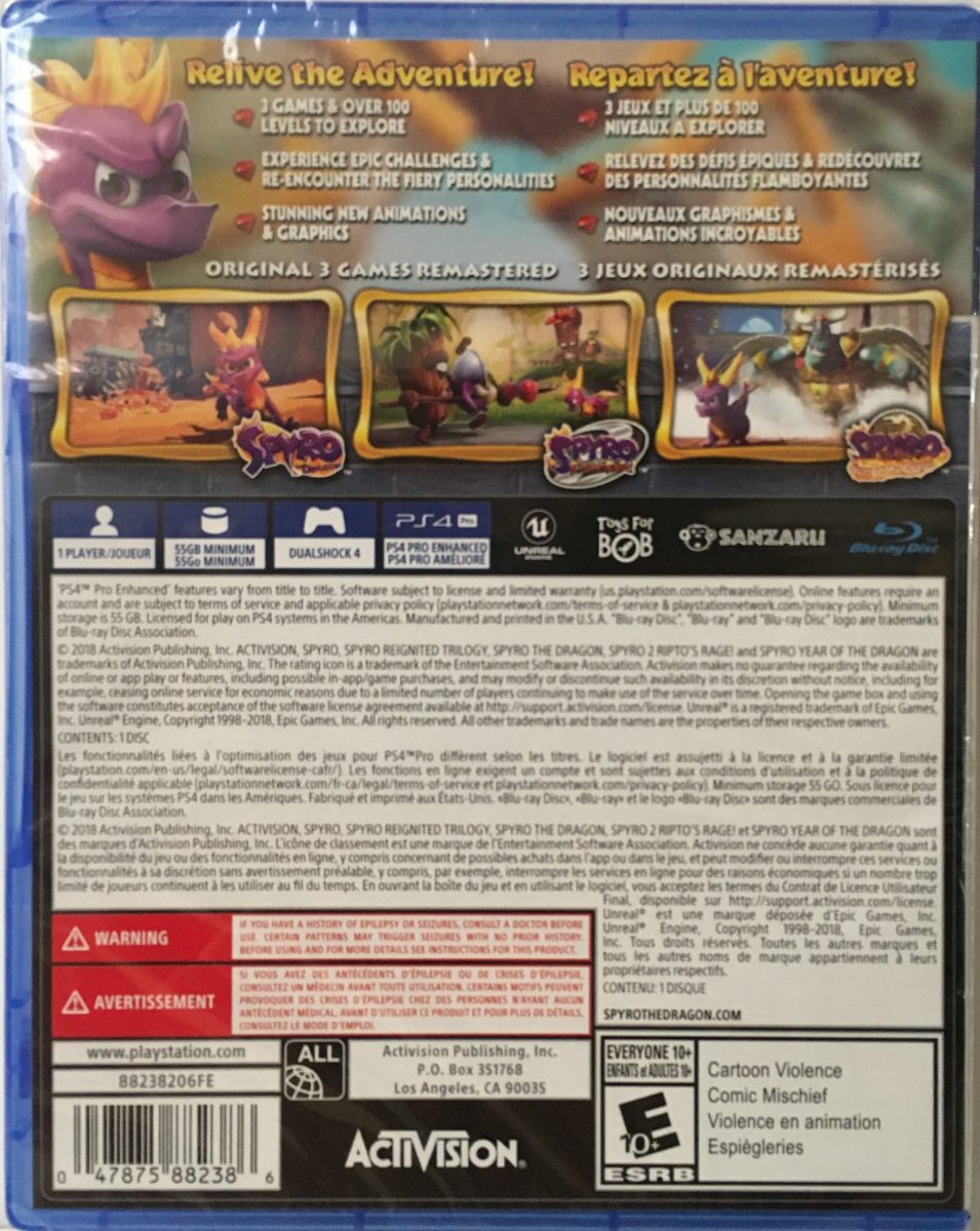 Spyro Reignited Trilogy for PlayStation 4 is a remastered collection of the first three games in the beloved Spyro series, originally developed by Insomniac Games. Released on November 13, 2018, by Activision, this trilogy brings the classic 3D platformers into the modern era with enhanced visuals and updated controls.