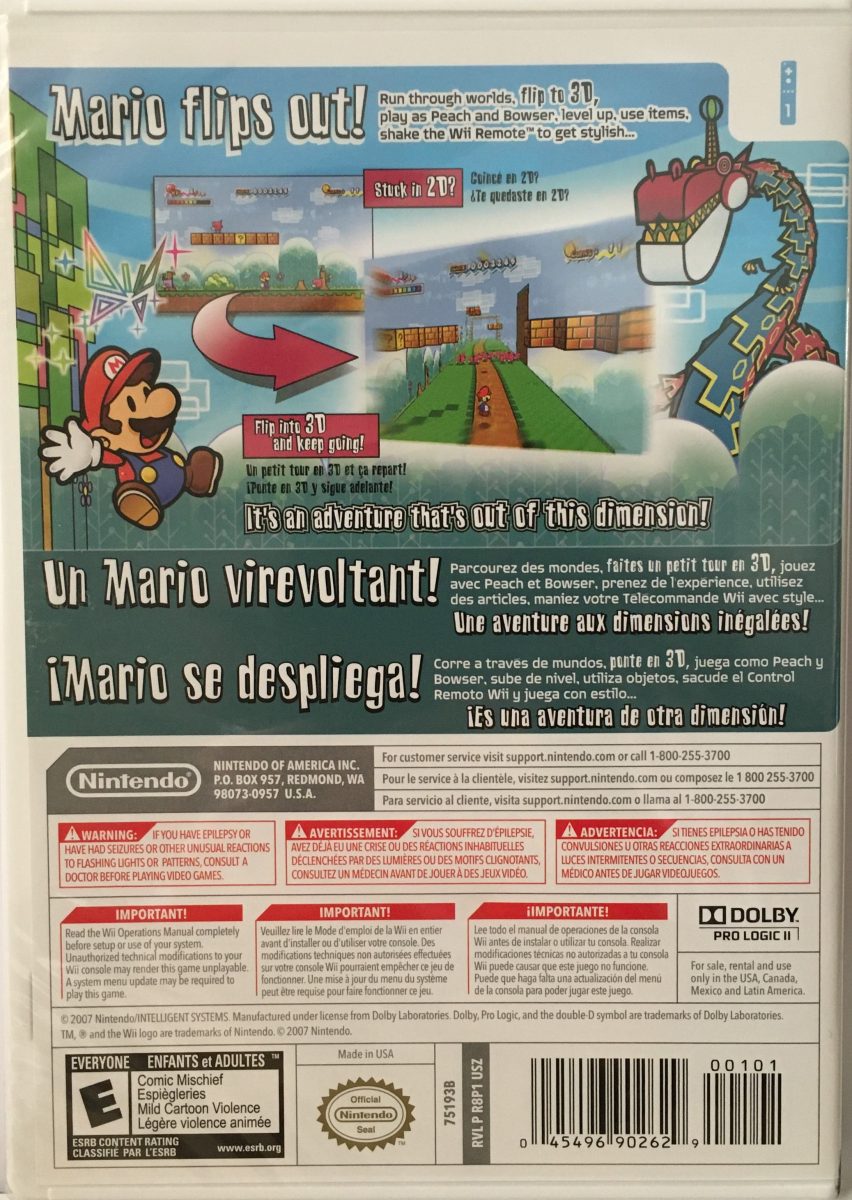 Super Paper Mario is a 2007 action role-playing game developed by Intelligent Systems and published by Nintendo for the Wii. It is the third installment in the Paper Mario series and the first Mario game on the Wii. The game follows Mario, Peach, Bowser, and Luigi as they attempt to collect Pure Hearts and stop Count Bleck and his minions from destroying the universe. Super Paper Mario has elements from RPGs and side-scrolling platformers; some critics described it as a hybrid of the two genres. The main feature is Mario’s ability to flip between 2D and 3D perspectives. Most of the game is played in a 2D perspective, with the 3D perspective being used to solve puzzles and access previously unreachable areas. Peach, Bowser, and Luigi also have unique abilities, and additional abilities can be gained through acquiring partner characters known as Pixls.