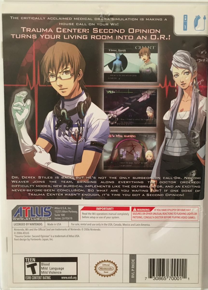 Trauma Center: Second Opinion is a simulation video game developed by Atlus for the Wii. The second entry in the Trauma Center series, Second Opinion is a remake of the Nintendo DS title Trauma Center: Under the Knife (2005). The game was released in North America and Japan in 2006 by Atlus as a console launch title, and in other regions in 2007 by Nintendo.