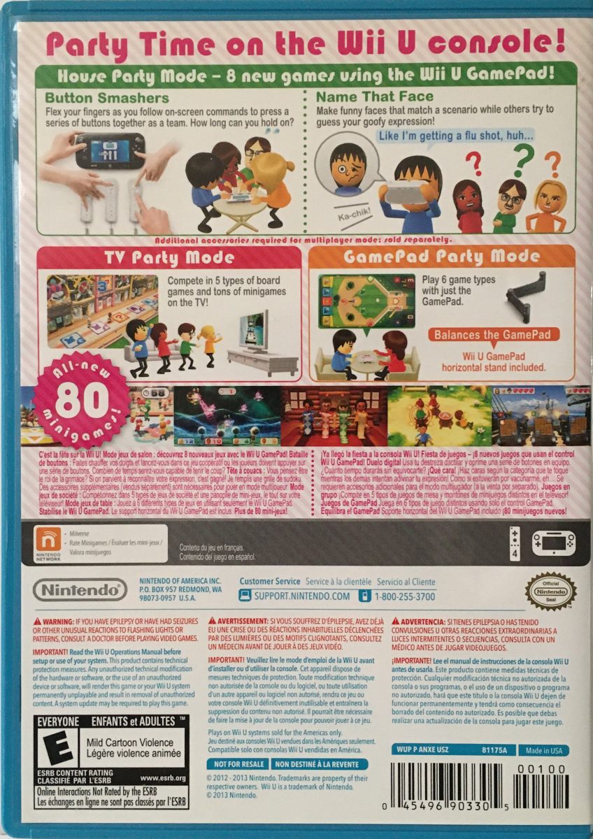 Wii Party U is a party video game developed by NDcube and published by Nintendo for the Nintendo Wii U. The game features a collection of over 80 minigames designed for local multiplayer, making use of both the Wii Remote and the Wii U GamePad to create varied gameplay experiences. Players compete or cooperate in board game-style modes and standalone minigames that focus on simple, accessible controls suitable for all ages. The Wii U GamePad is often used in unique ways, such as hiding information or creating asymmetric gameplay between players, adding variety and unpredictability to each session.