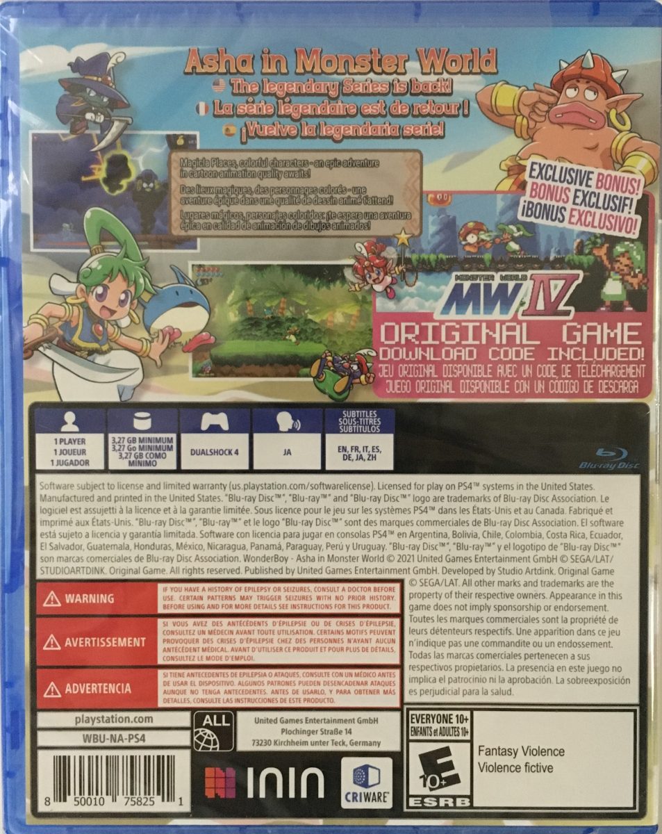 Wonder Boy: Asha in Monster World (PS4/PS5) is a vibrant side‑scrolling action‑platformer in which you play as Asha, a young warrior on a mission to rescue her world. Joined by her flying companion Pepelogoo, Asha explores varied environments — from ice caverns to fiery volcanoes — fighting monsters, solving puzzles, and unlocking upgrades for her sword, shield and health. The game blends classic platform gameplay with light RPG elements and allows Pepelogoo to help you double‑jump, glide, or access hidden areas. With a colourful, modern 2.5D look, it’s a faithful remake of the classic “Monster World IV,” offering both nostalgia and accessibility for old‑school and new players alike.