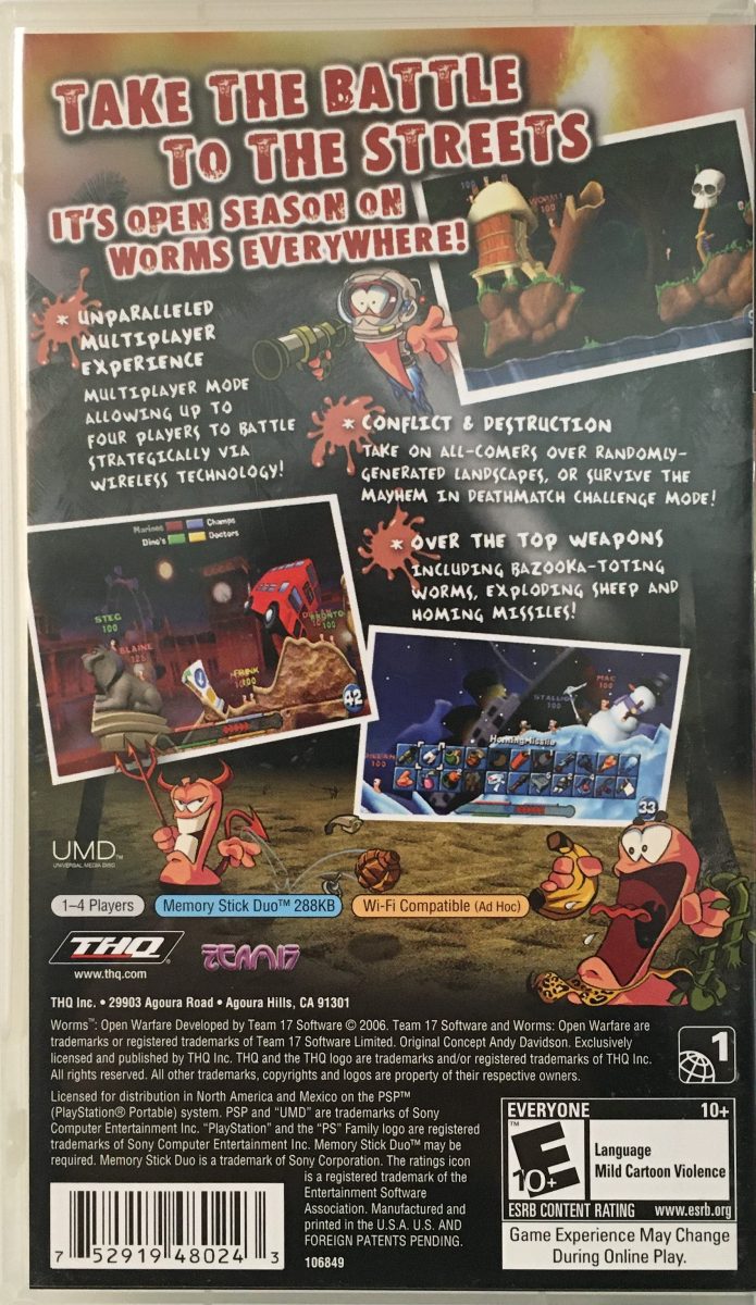 Worms: Open Warfare PSP is a turn-based strategy game where players control a team of cartoonish worms engaged in tactical battles across destructible landscapes. Each team takes turns moving, aiming, and firing a wide variety of creative weapons, from bazookas and grenades to explosive sheep and air strikes. The game features both single-player missions and multiplayer modes, offering strategic depth with terrain deformation, environmental hazards, and clever weapon use. Known for its humor, chaotic action, and tactical challenge, Worms: Open Warfare PSP captures the classic Worms experience on a portable platform.